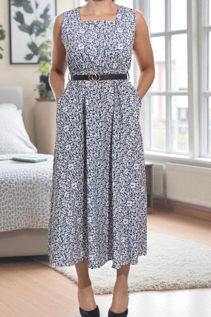 Ladies Floral Pocket Flare Dress- Beige And Navy (Excl Belt)