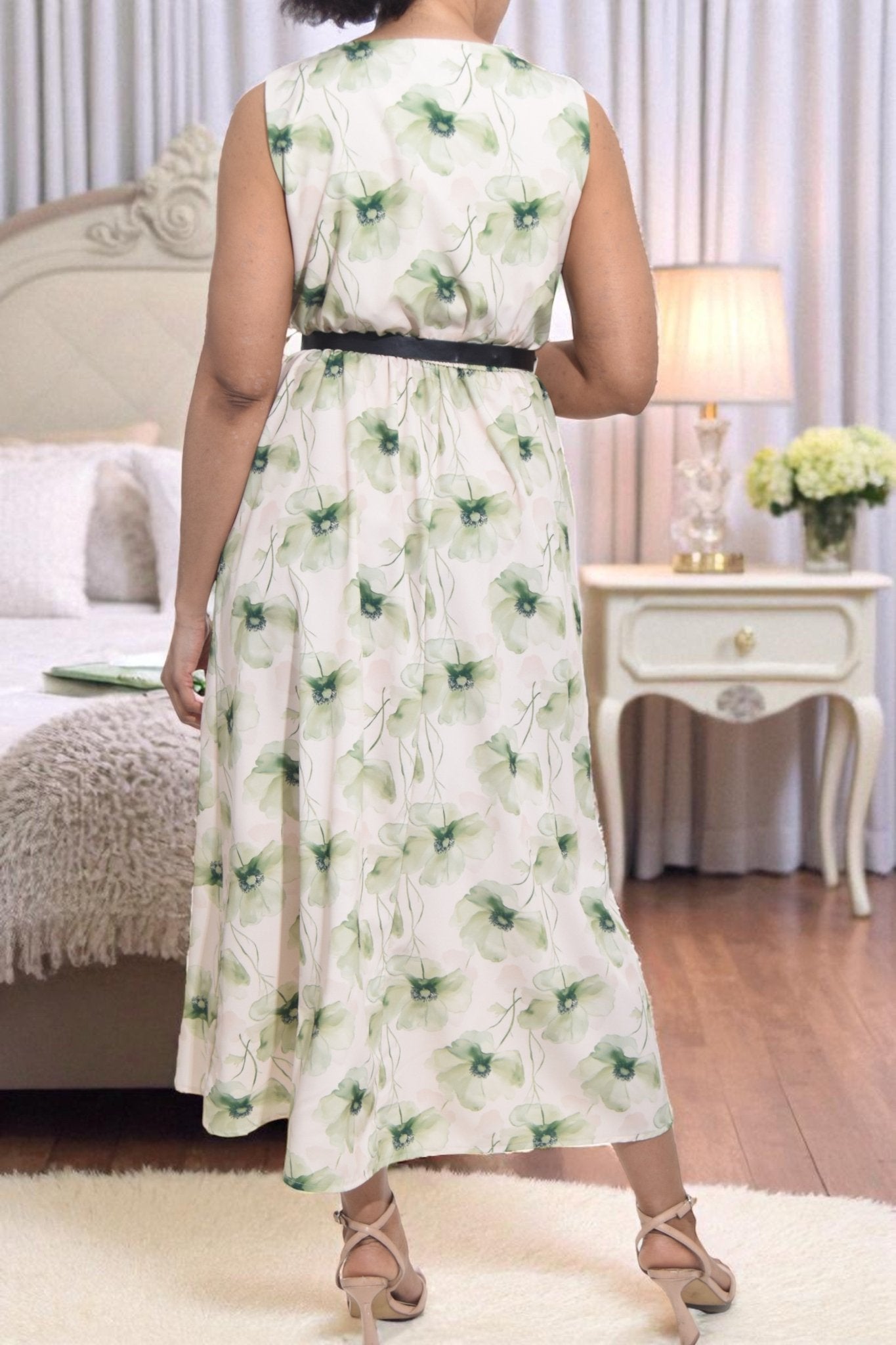 Ladies Pocket Flare Dress-Olive Floral (Excl Belt)