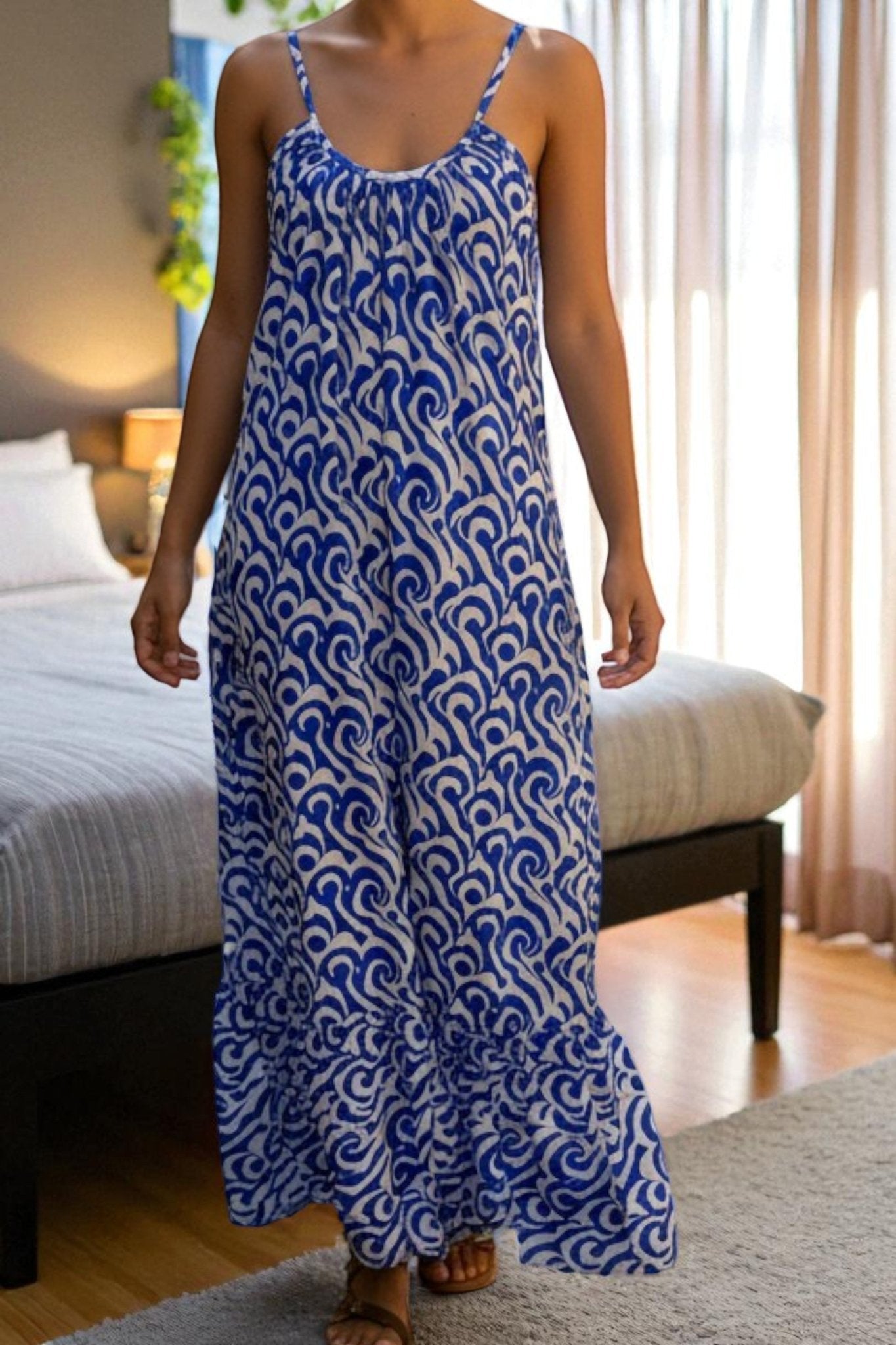 Ladies Cream Printed Strappy Ruffle End Dress