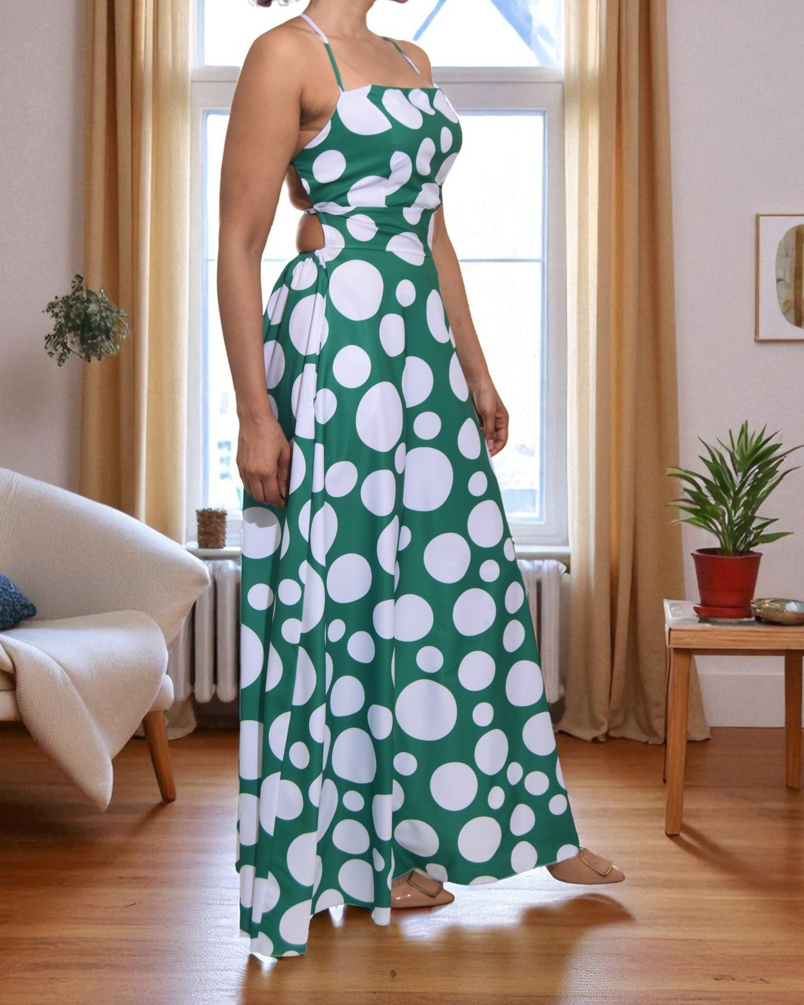 Ladies Green Polka Dot Pocket Dress