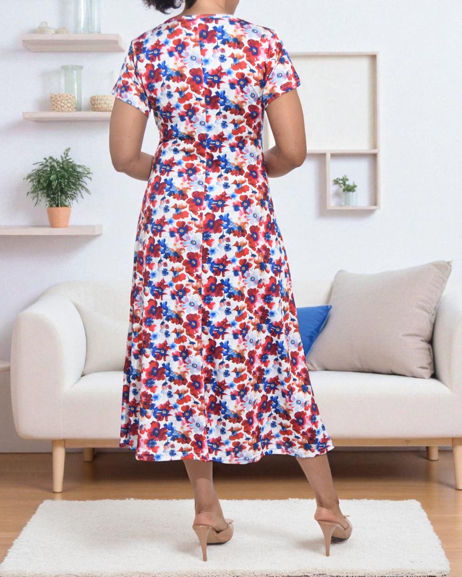 Ladies Red Floral A Line Midi Dress