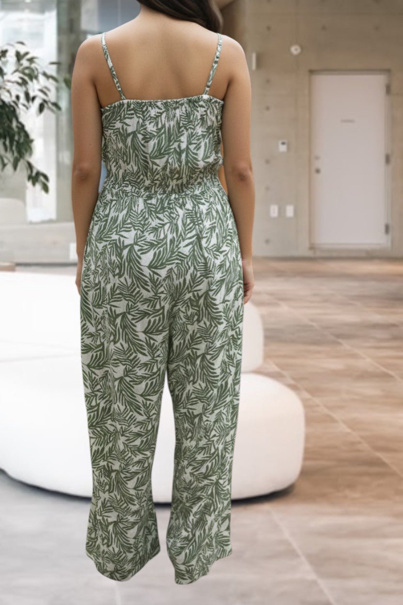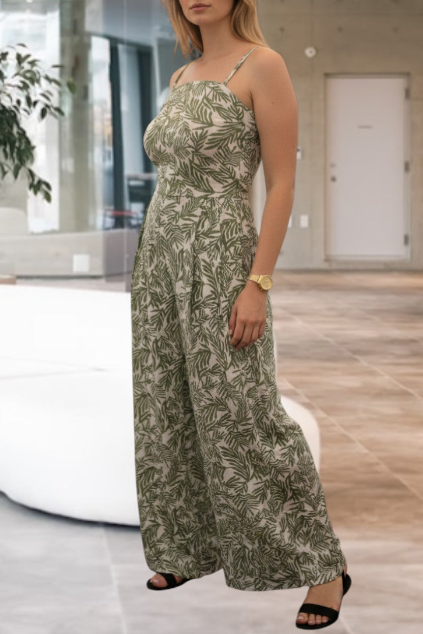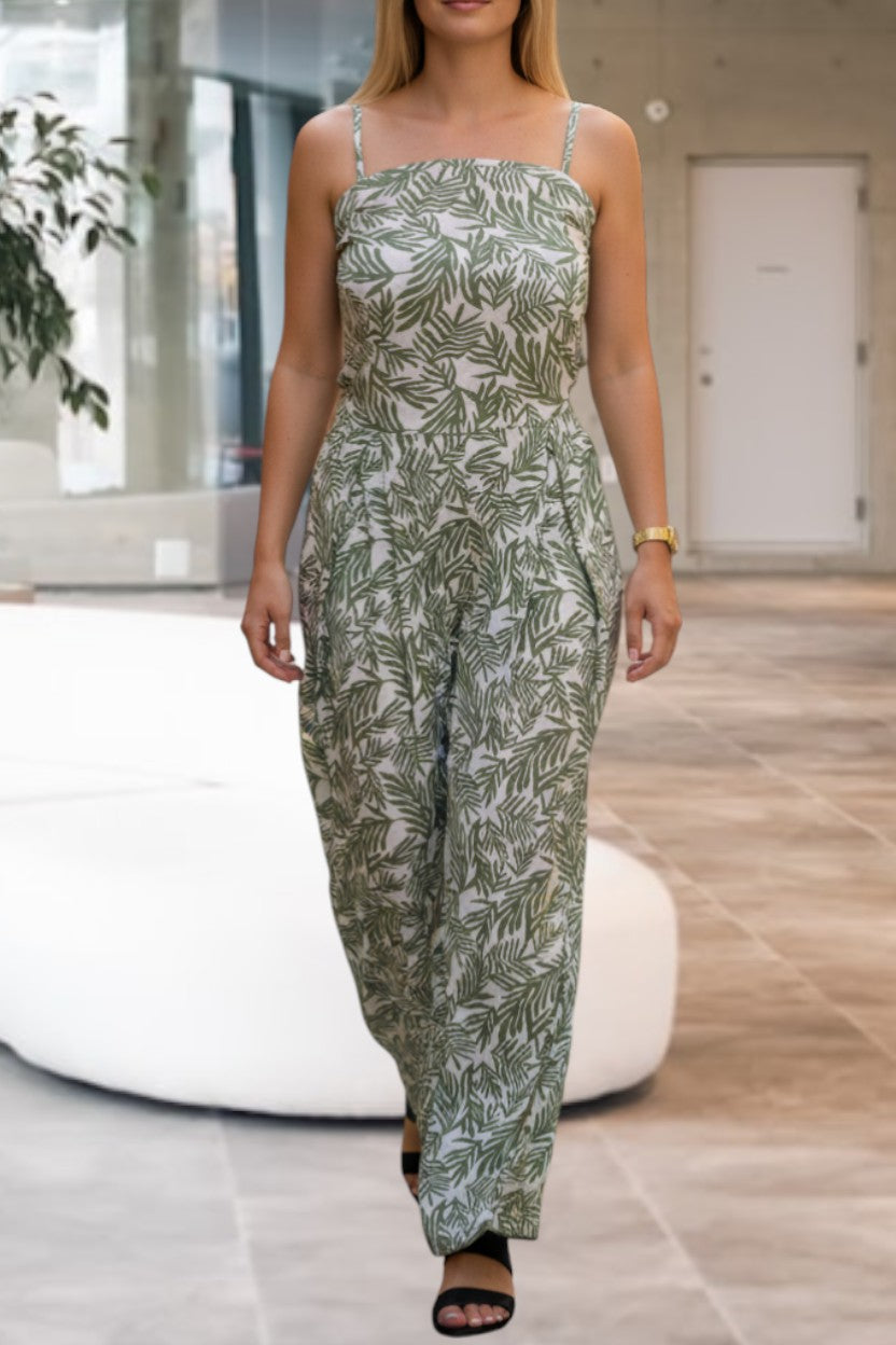 Ladies Olive Floral Strappy Pleated Jumpsuit
