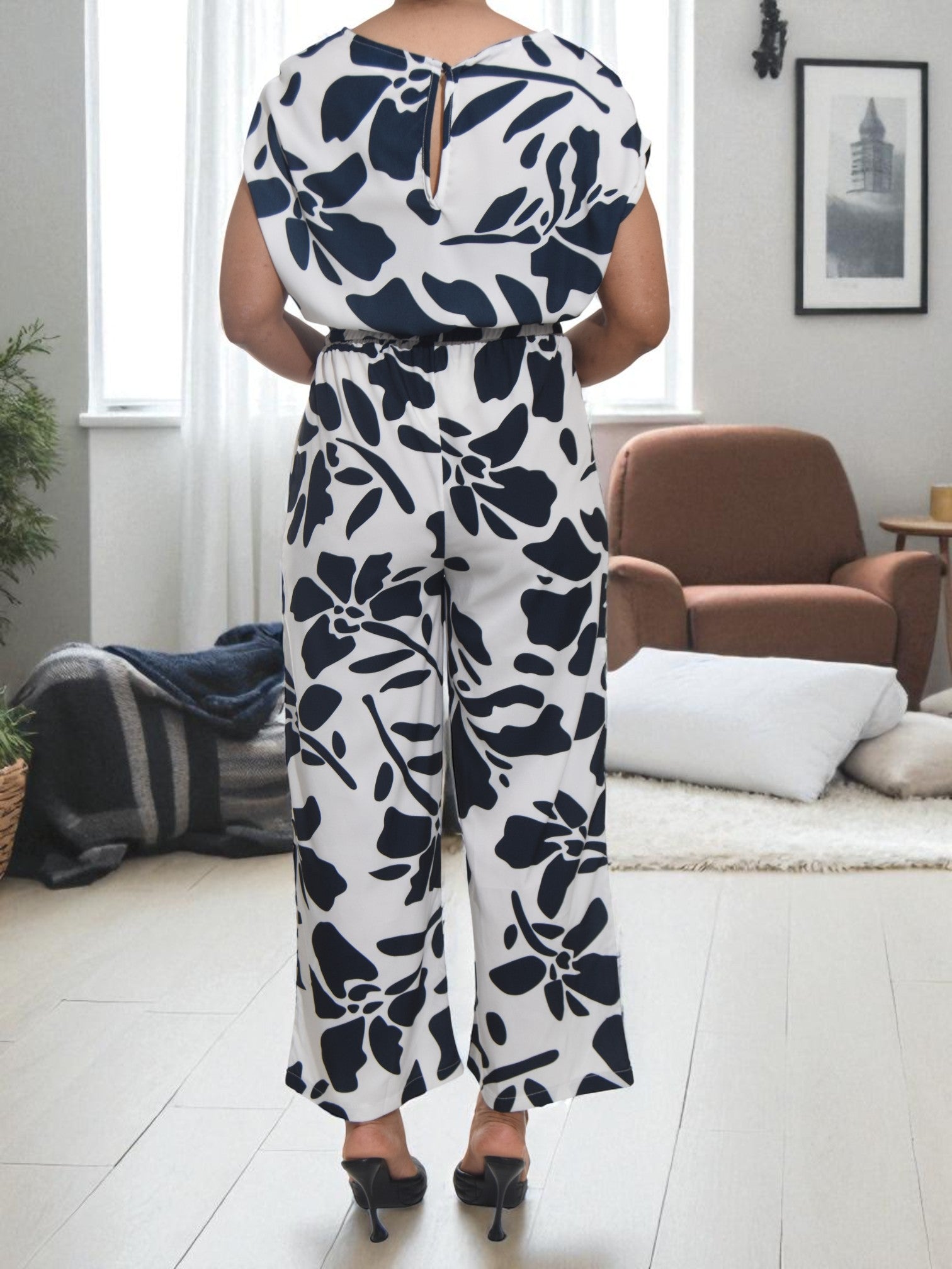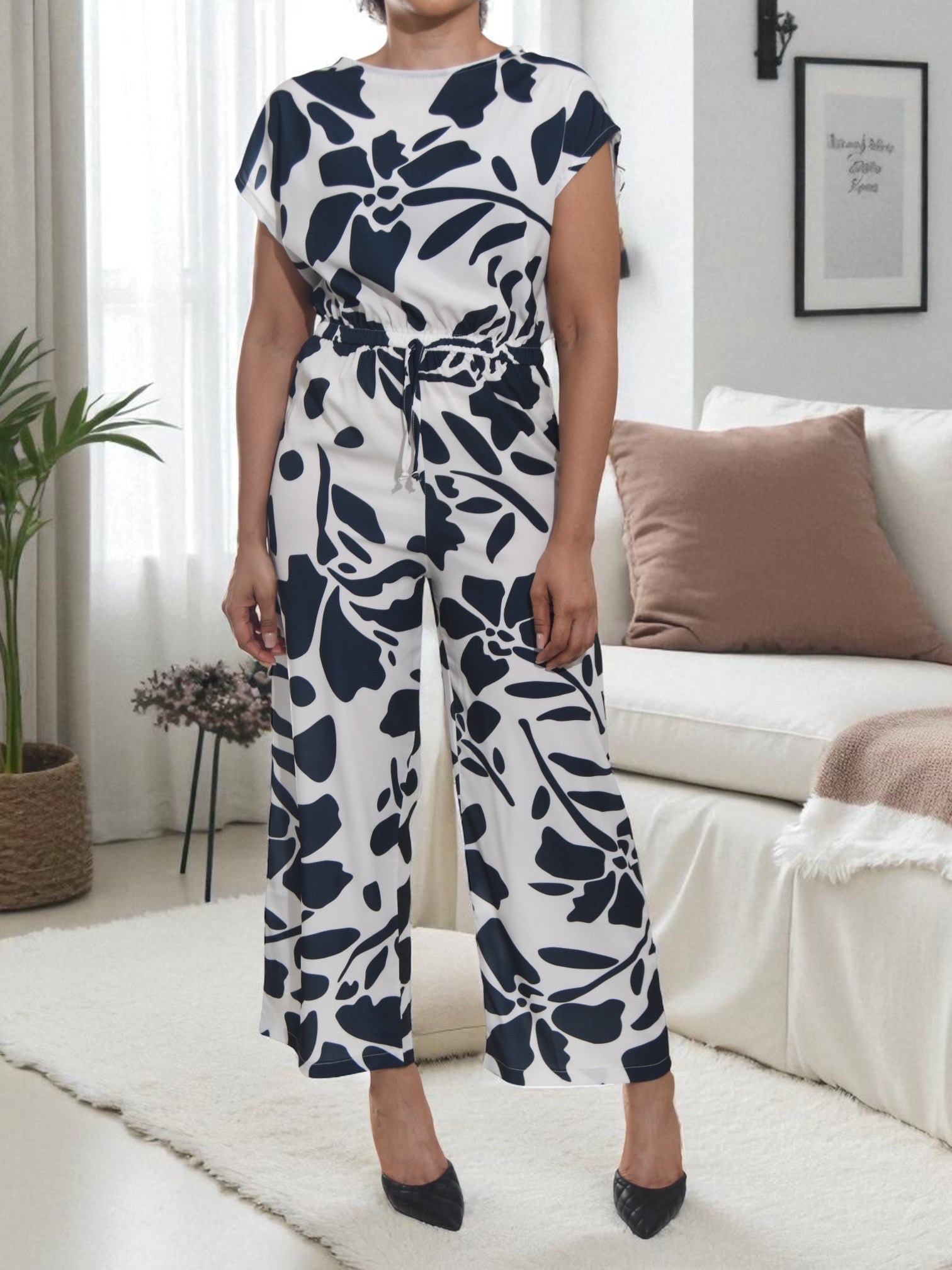 Ladies Navy Floral Wide Leg Jumpsuit