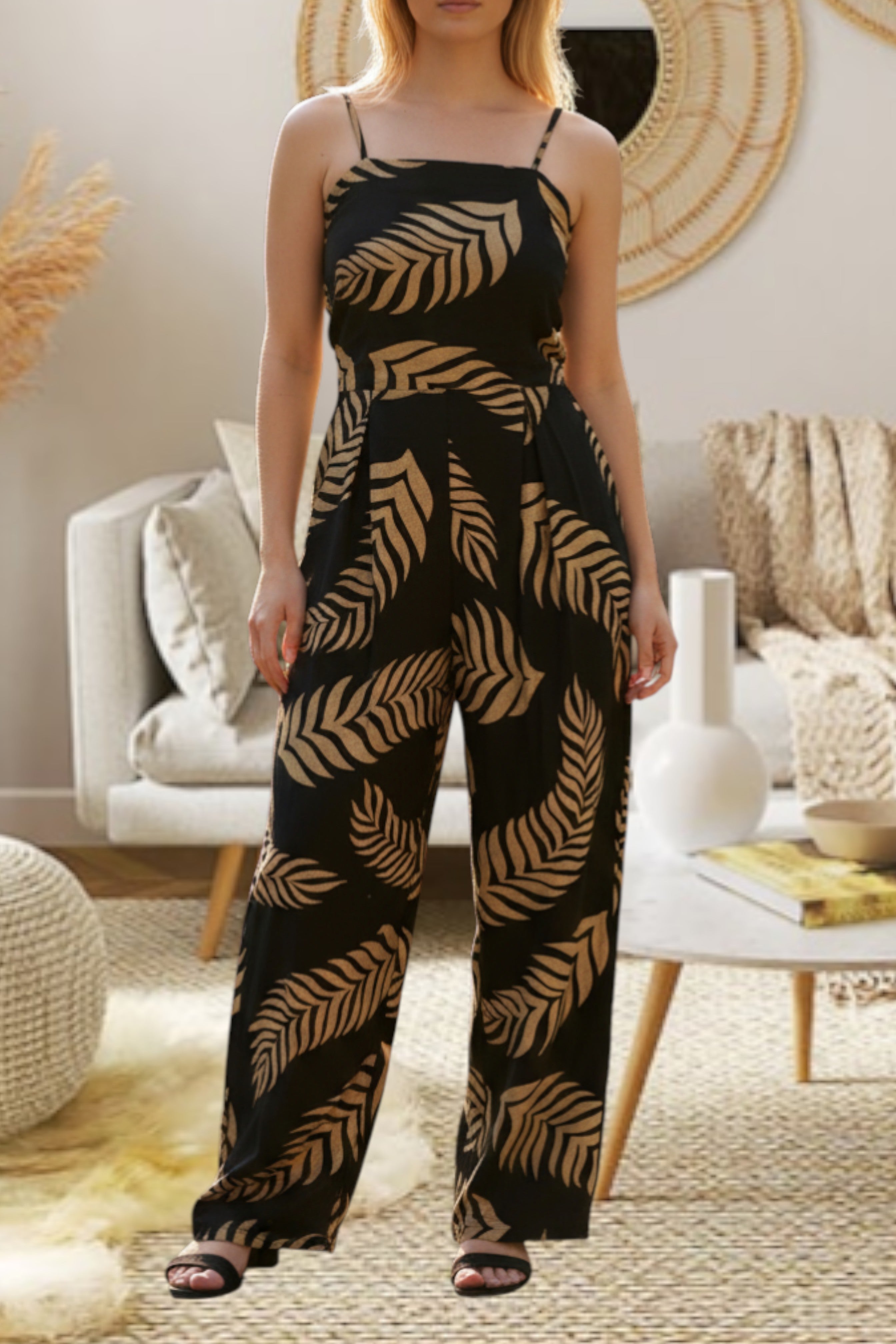 Ladies Leaf Print Strappy Pleated Jumpsuit