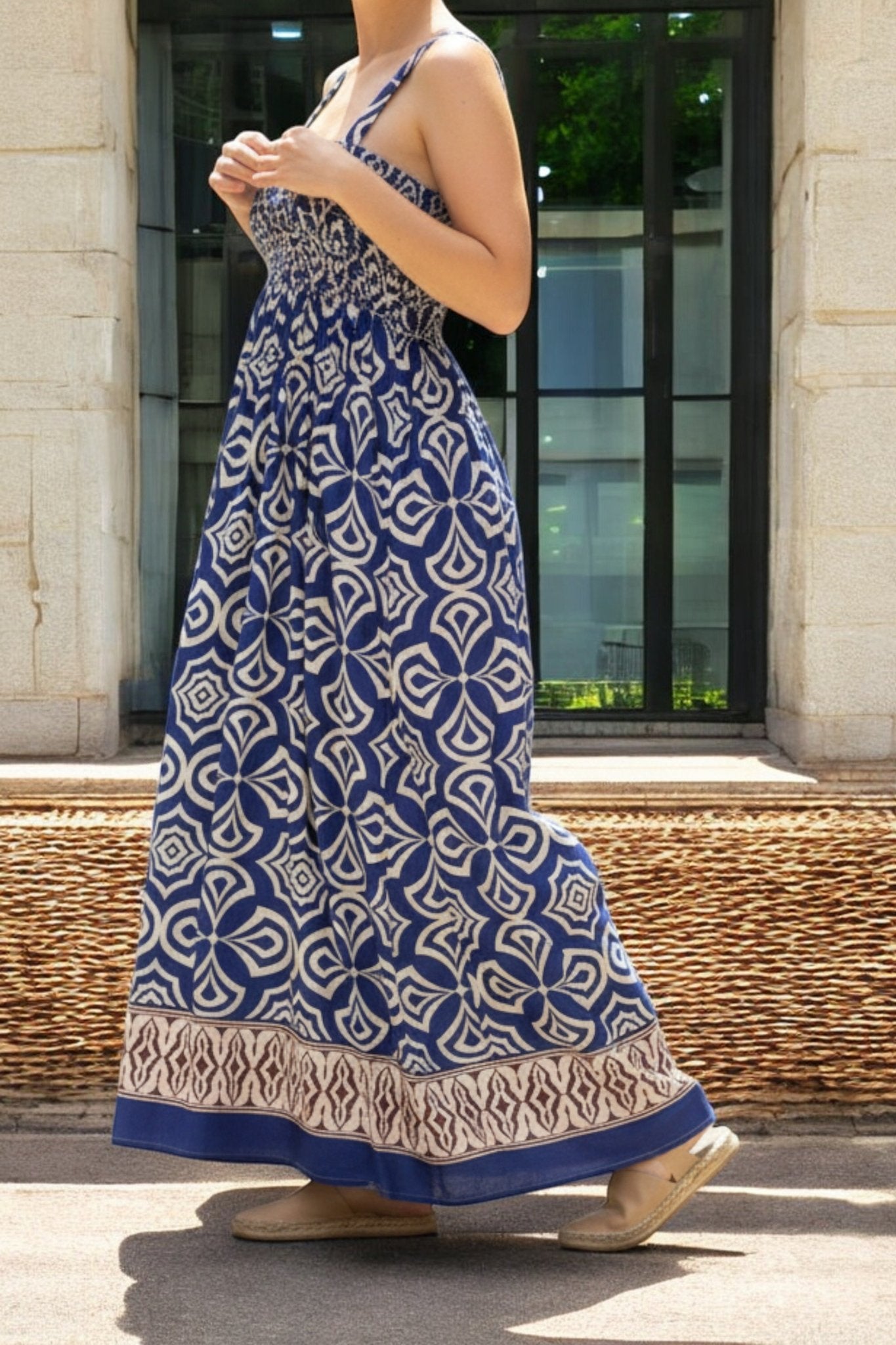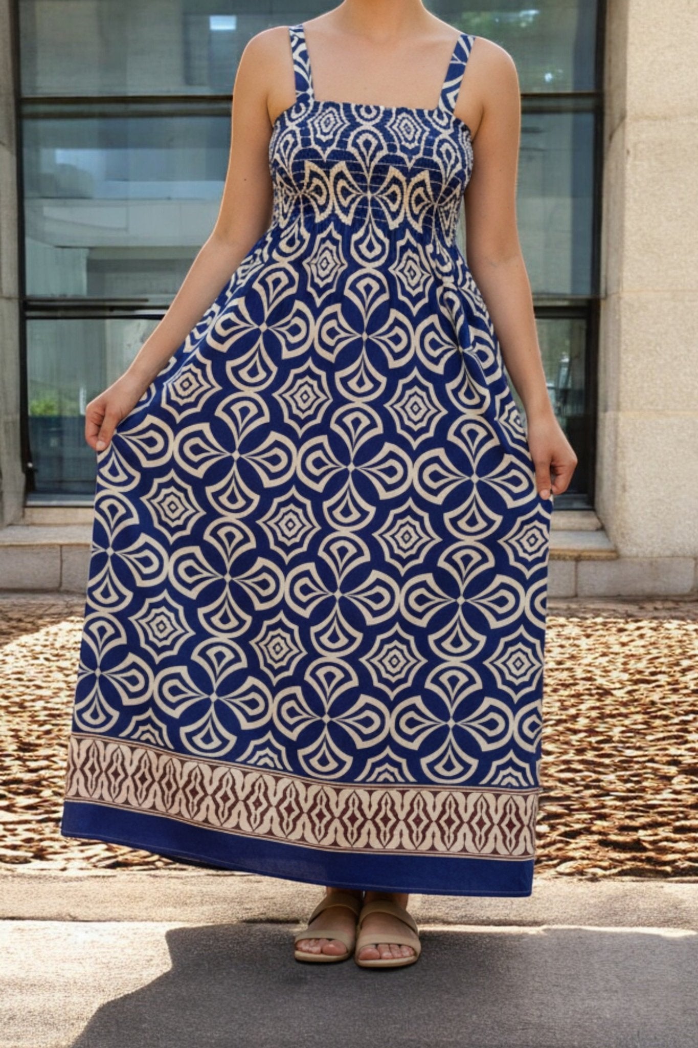 Ladies Border Print Strappy Dress-Royal