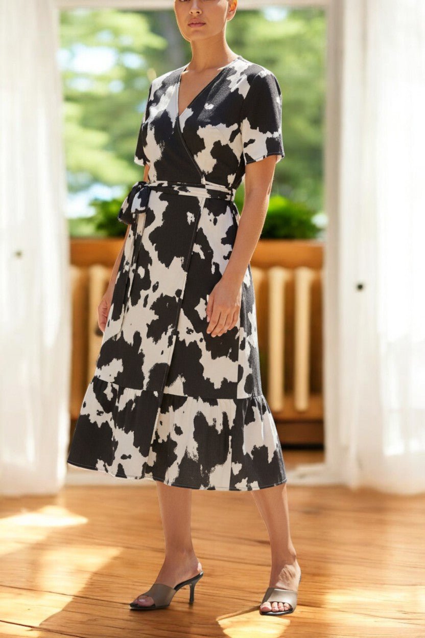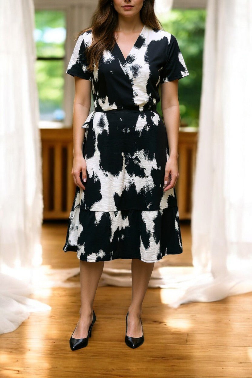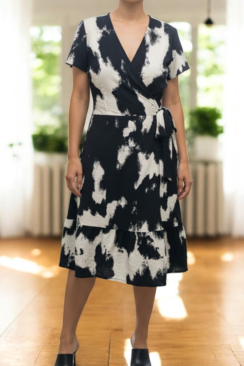 Ladies Floral Ruffel Wrap Dress -Black And White
