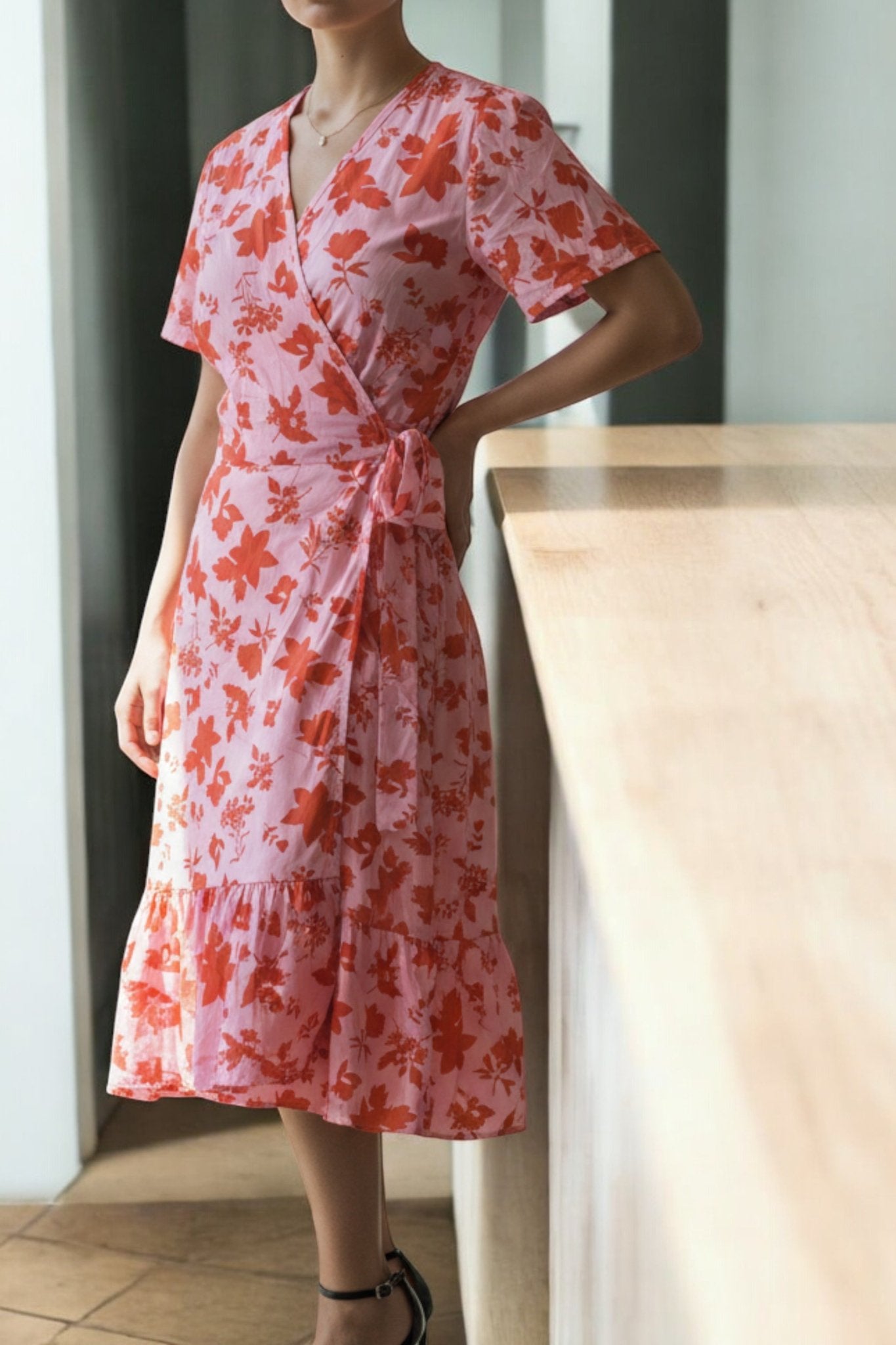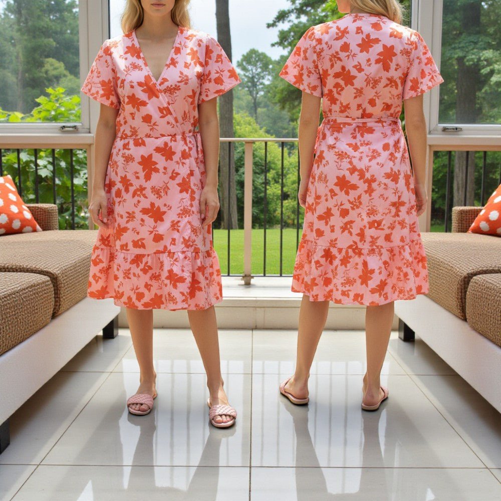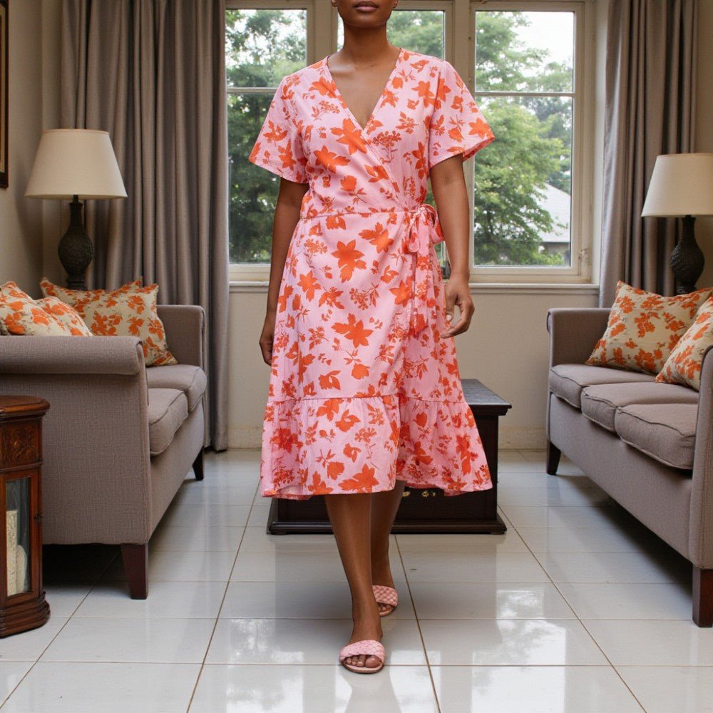 Ladies Floral Ruffel Wrap Dress - Orange Floral