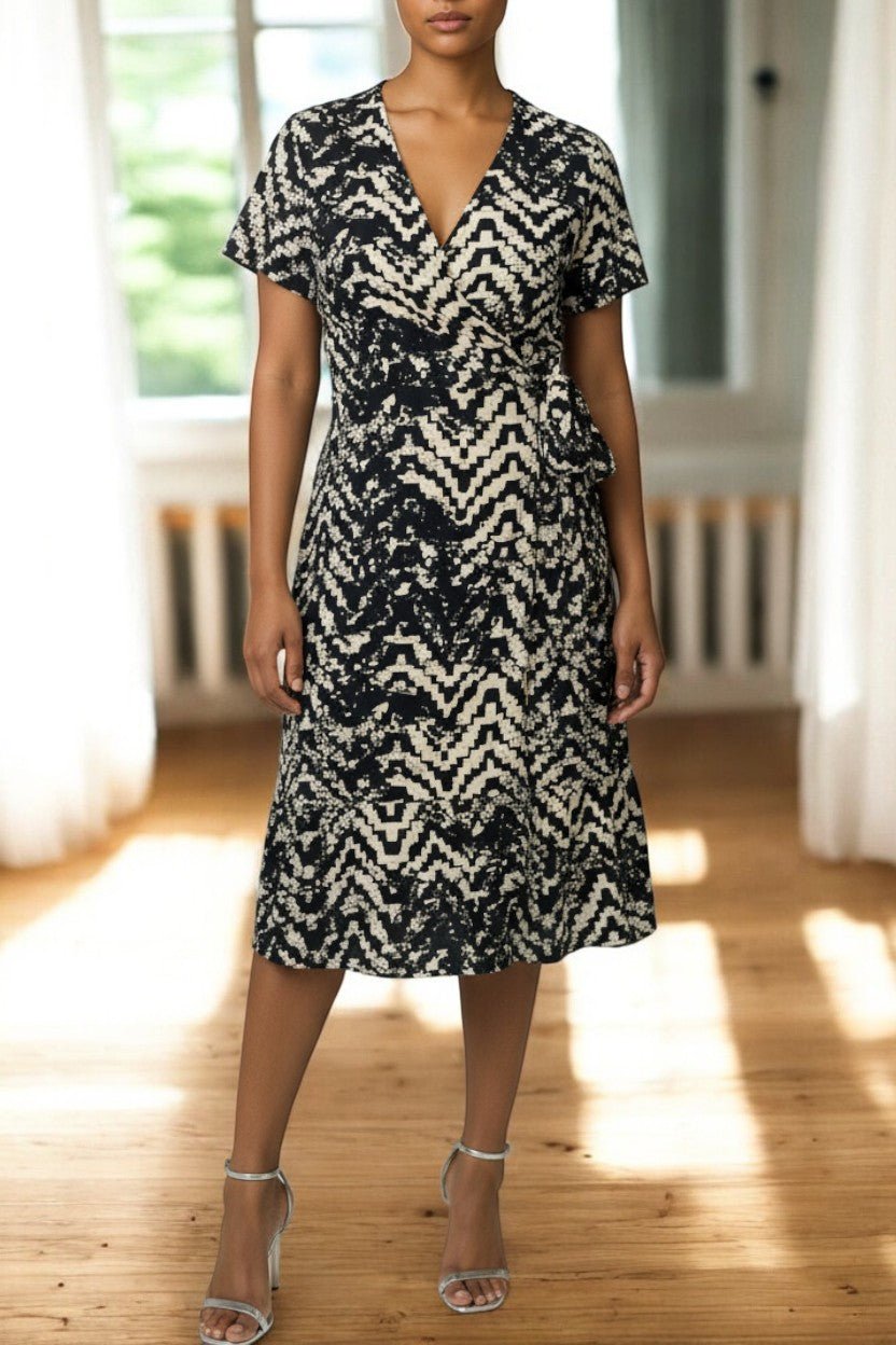 Ladies Ruffel Wrap Dress - Cream And Black
