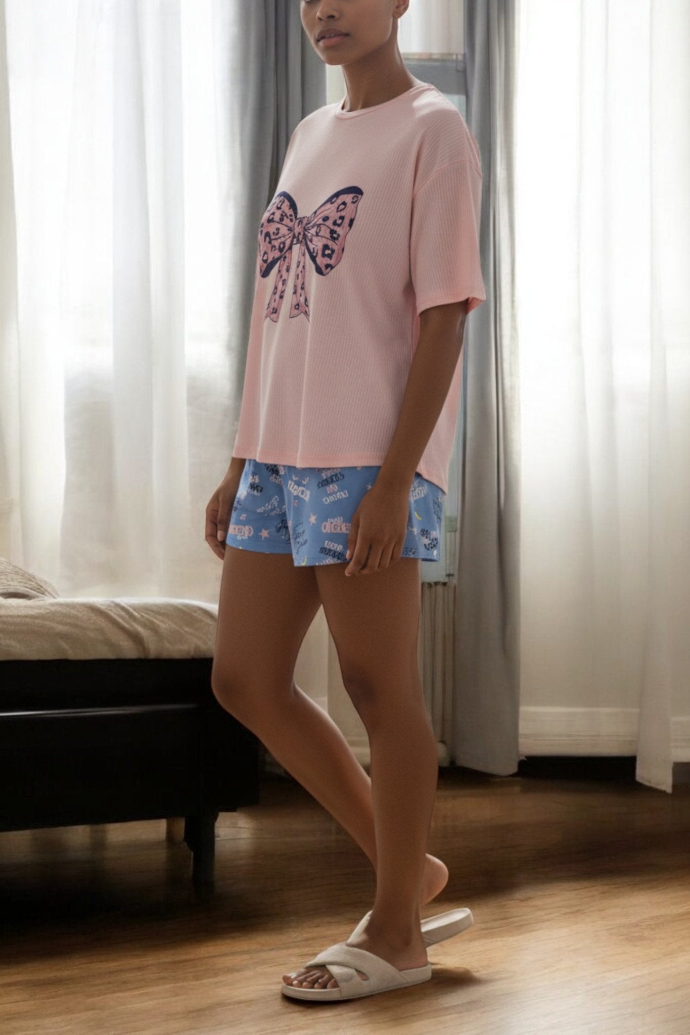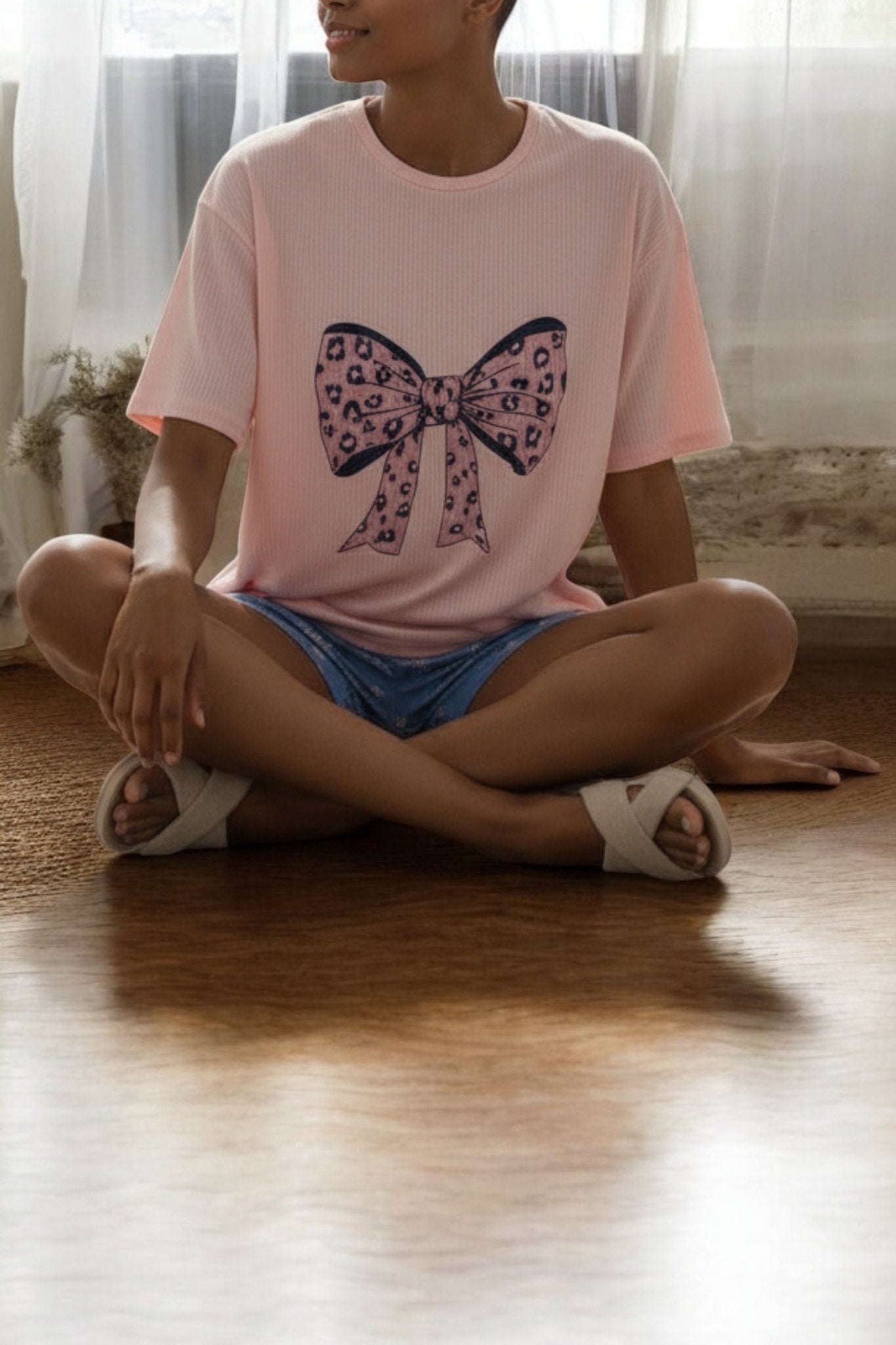 Ladies Pink Rib Knit Pj Set-Bow