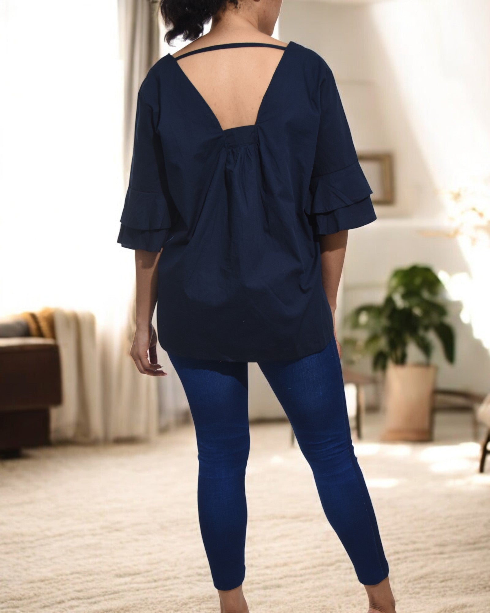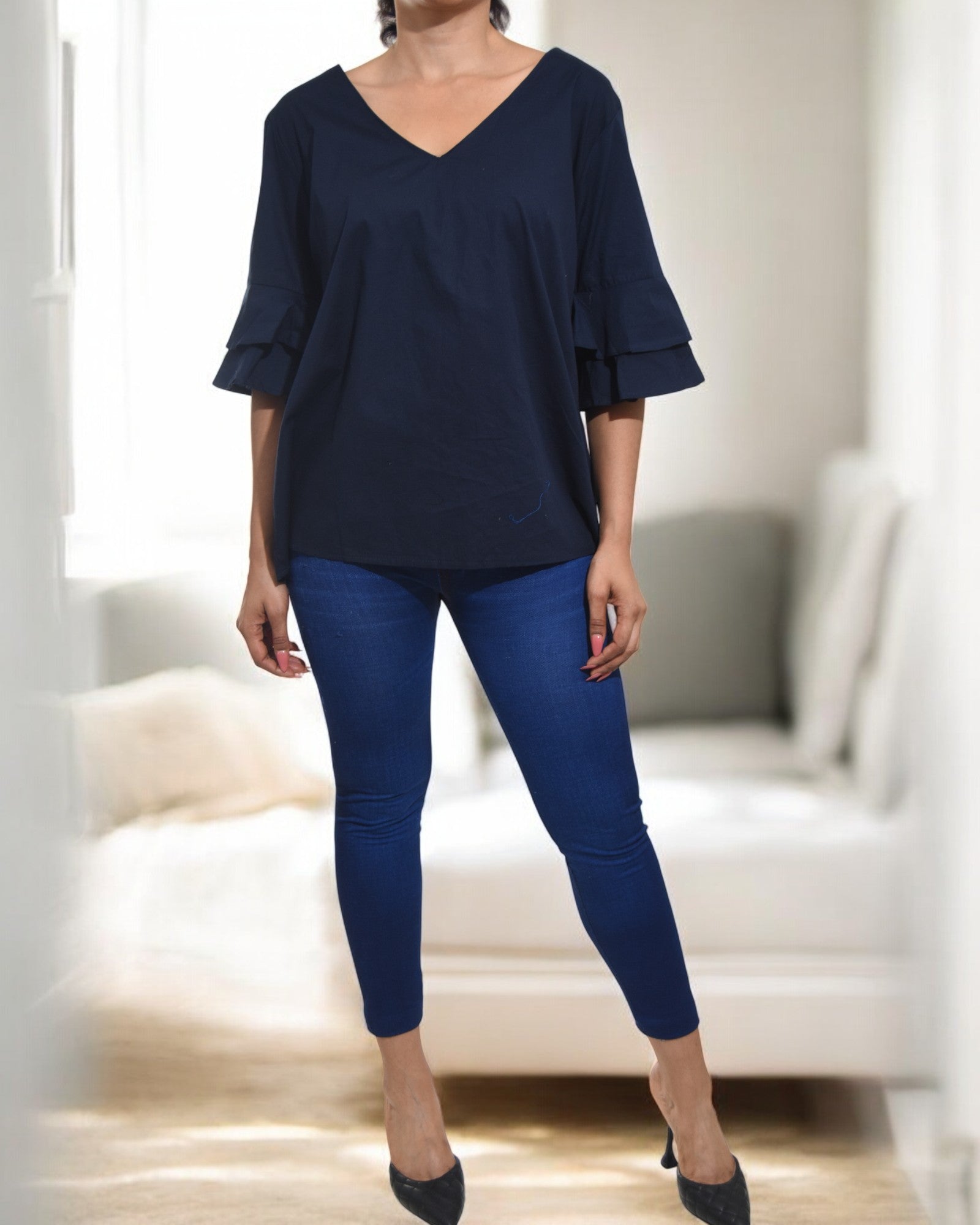 Ladies Navy Ruffle Sleeve Top