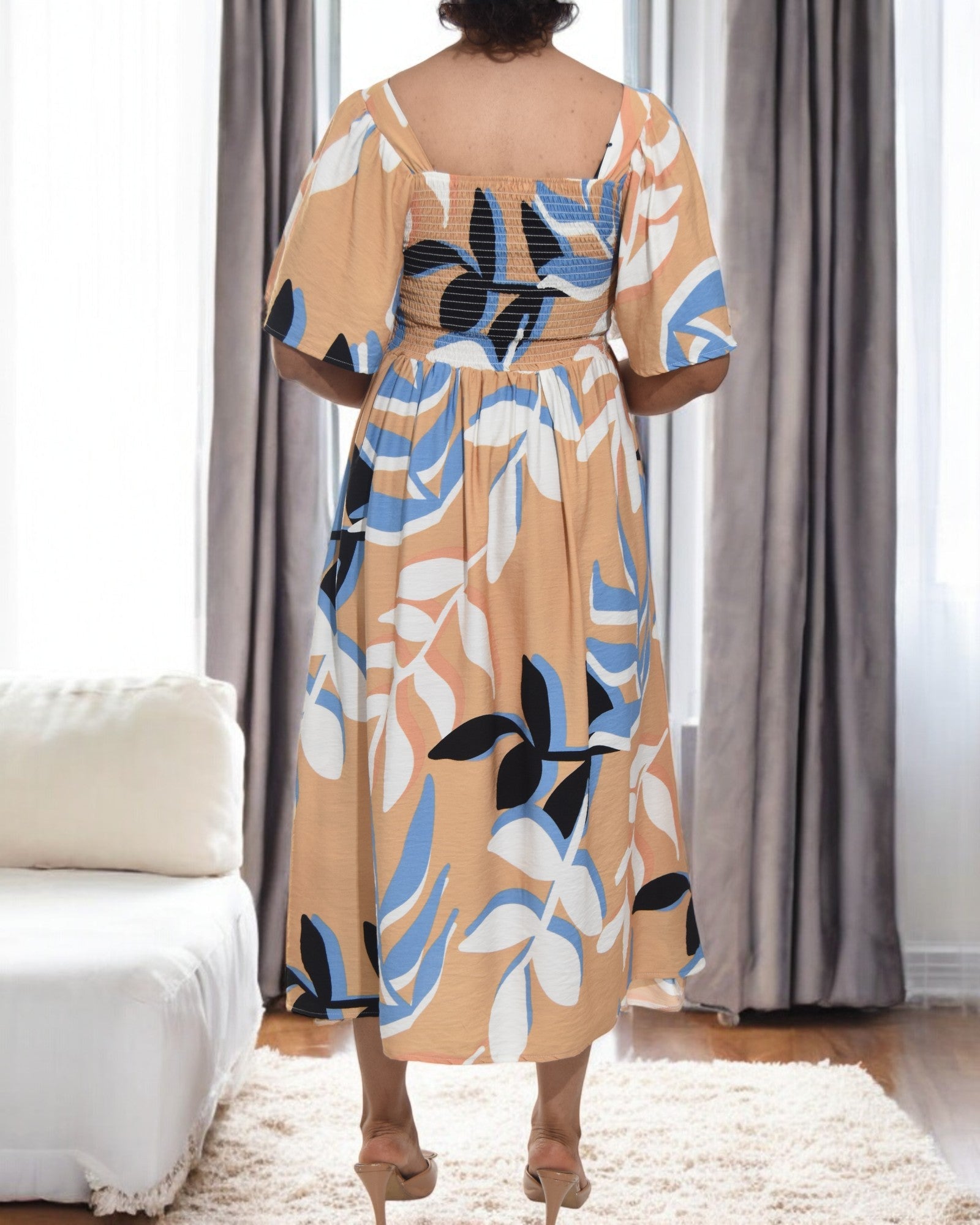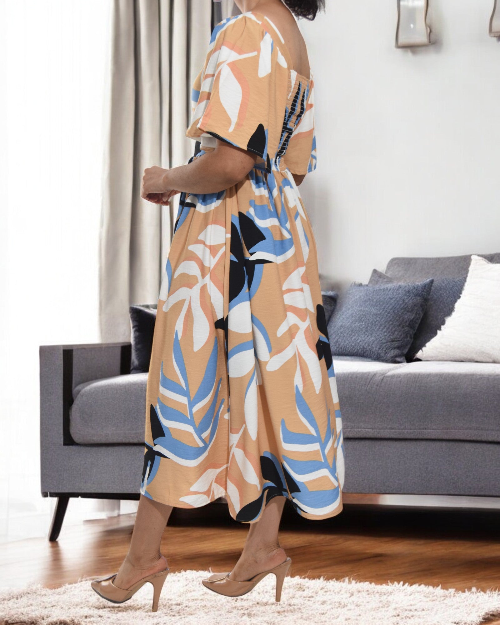 Ladies Leaf Print Square Neck Dress