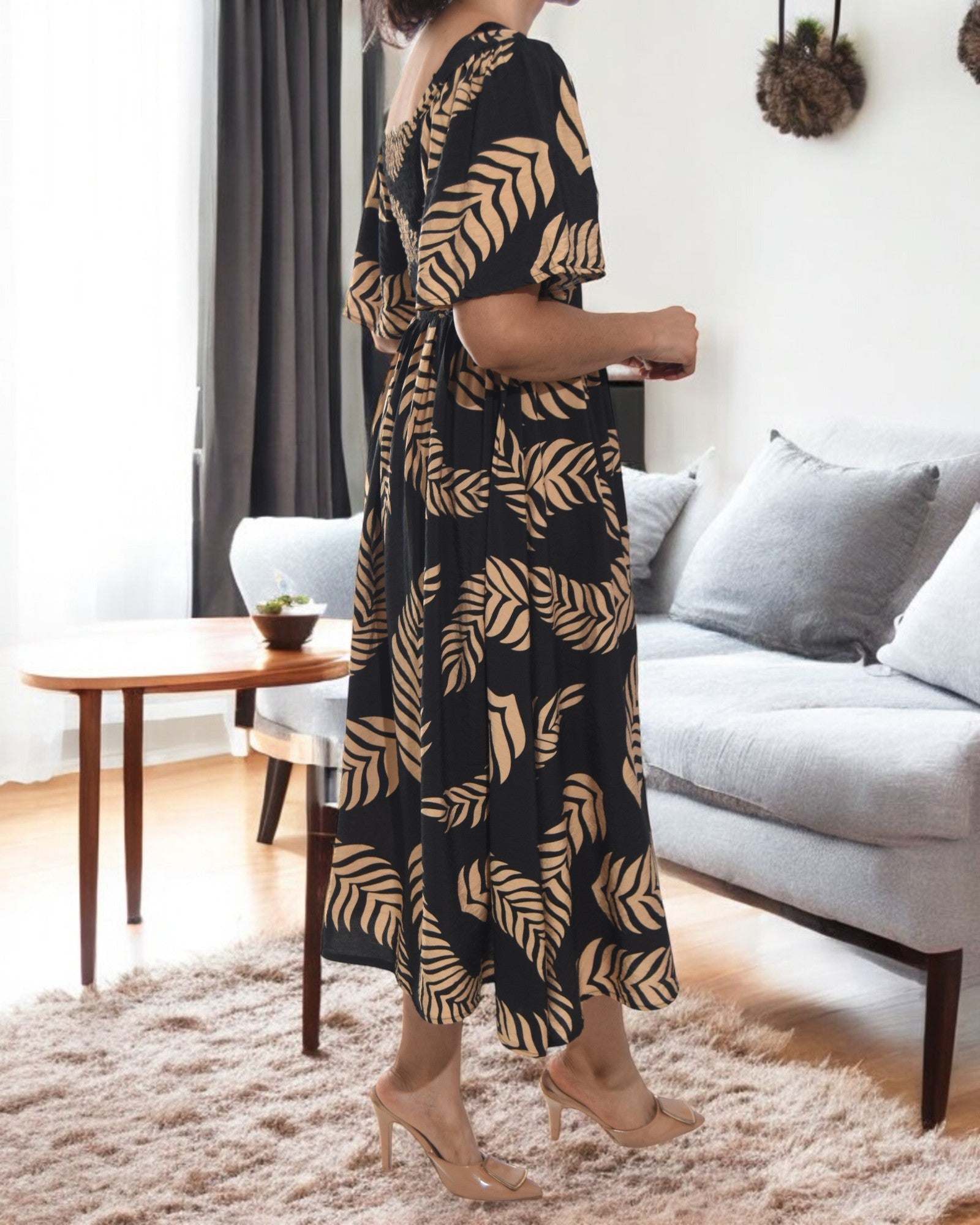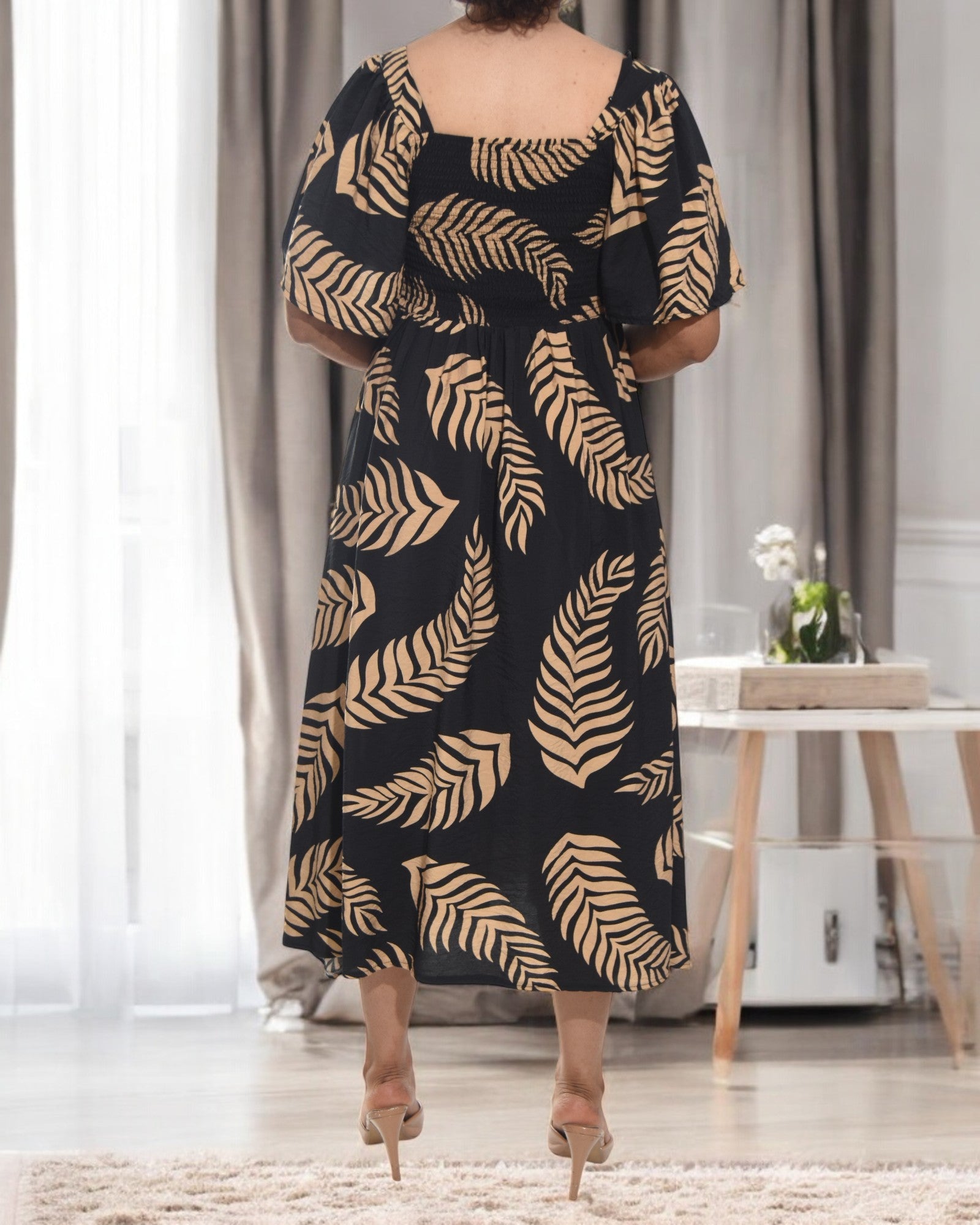 Ladies Brown Fern Print Square Neck Dress